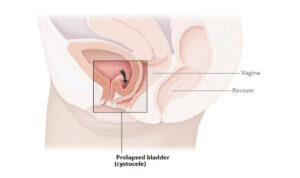 A cystocele, or bladder prolapse, occurs when the wall between the bladder and vagina weakens, allowing the bladder to drop into or bulge through the vaginal space.